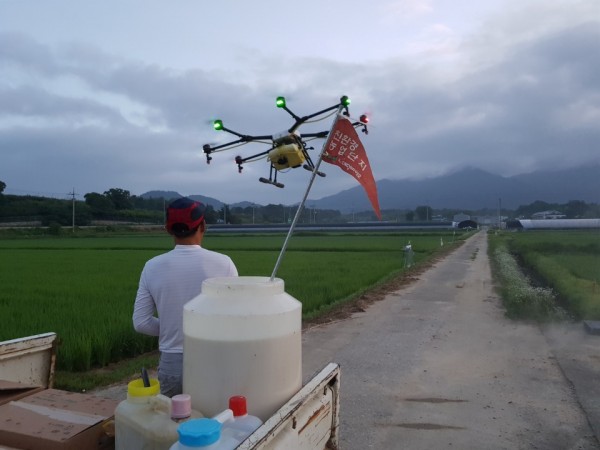 [사진1: 드론항공방제 작업모습- 대덕바이오 친환경사업부 제공]