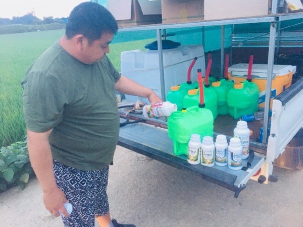 [사진1: 당사의 4가지 친환경유기농자재(대용량 4L)를 비율에 따라 희석하는 모습- 친환경사업부 제공]